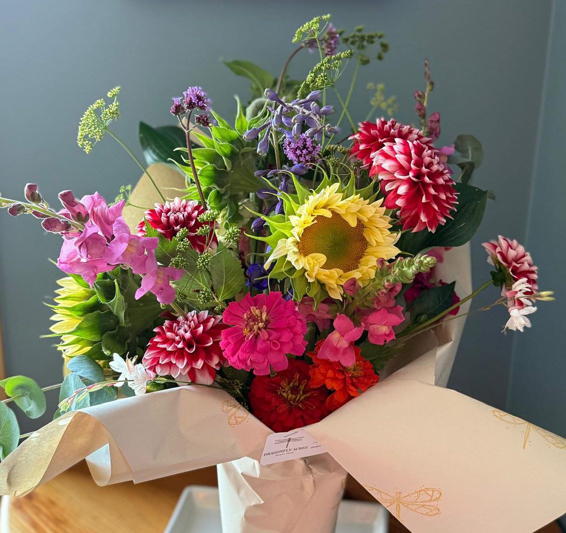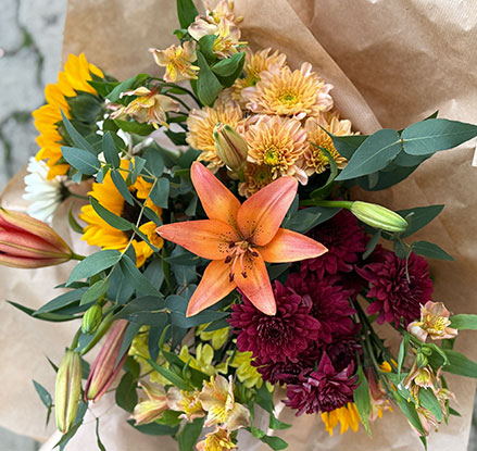A freshly cut and wrapped bouquet delivered to Drayton Valley. The flowers chosen will depend on what is blooming the day before delivery.